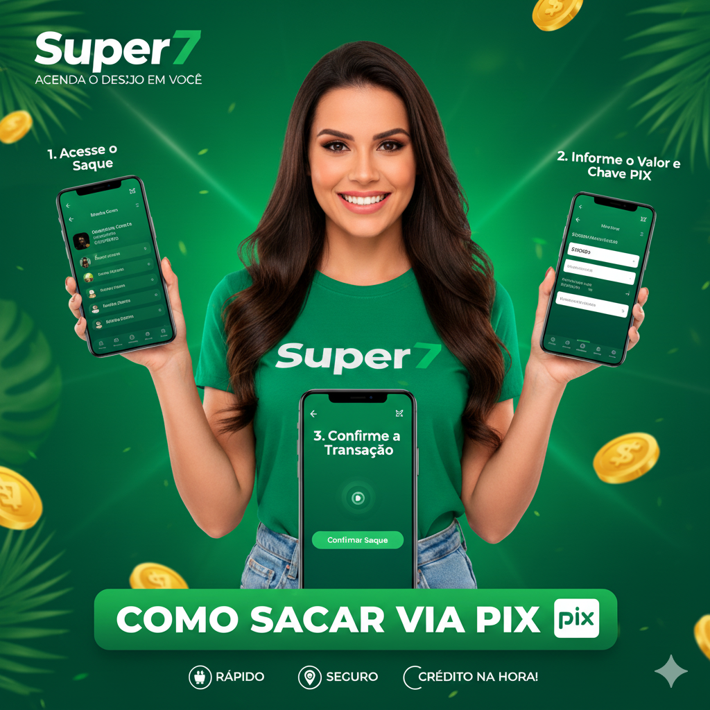 Saque seus ganhos na Super7 de forma instantânea e 100% segura. Guia completo para saque via PIX, limites e política de segurança. Sua vitória está garantida!